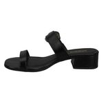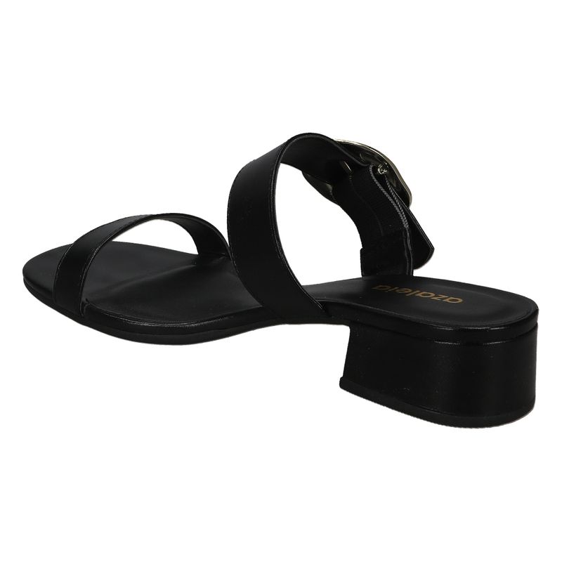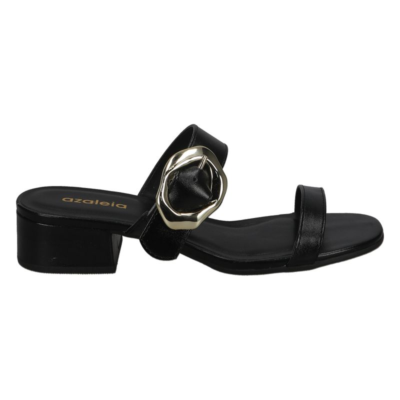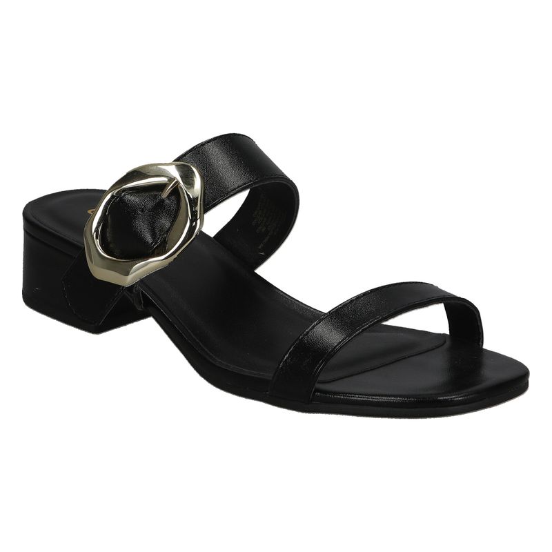 Sandalia de tacón bajo con detalle metálico en la tira trasera, ideal para un look sofisticado y versátil.