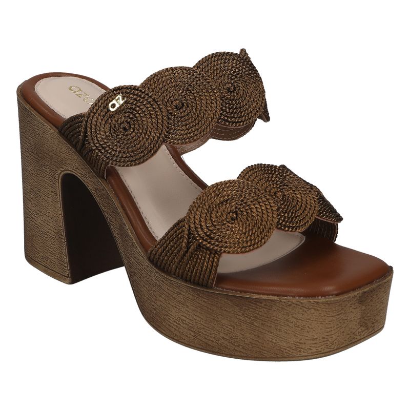 Sandalia de plataforma con tacón alto y tiras tejidas en diseño circular que aportan un toque artesanal y elegante. Ideal para elevar cualquier look con estilo y comodidad.