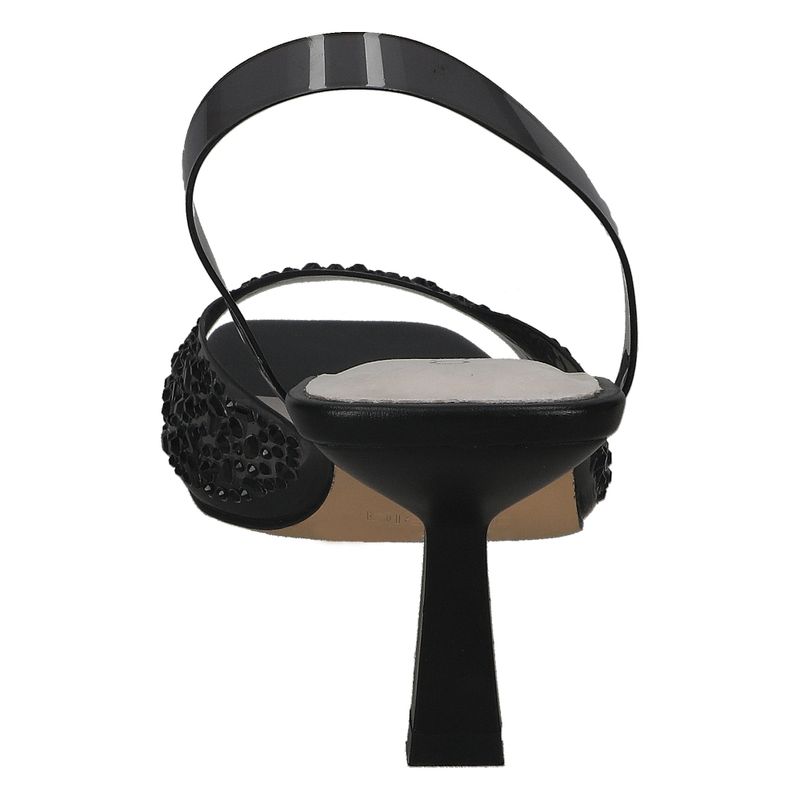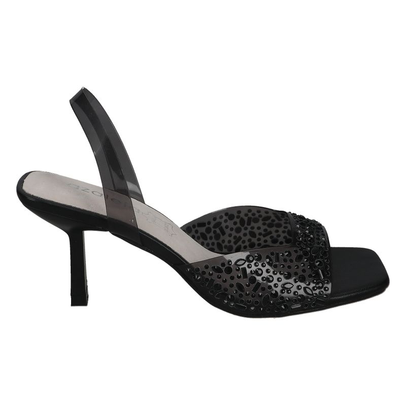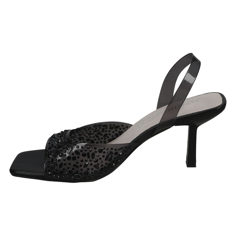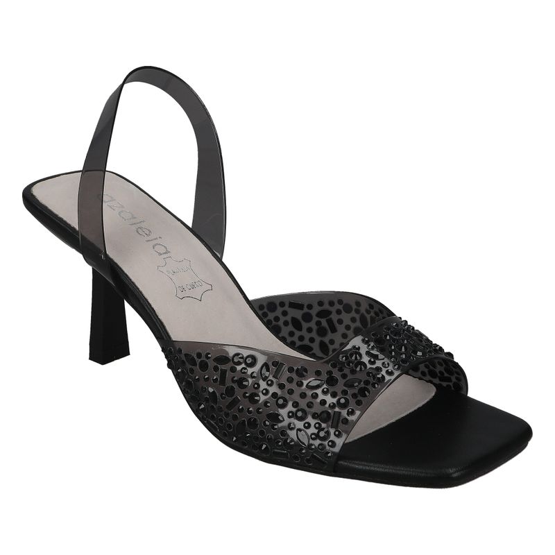 Sandalia de tacón con correa y tiras transparentes con detalles de pedrería ofrece un estilo elegante y moderno combinando glamour y distinción.