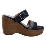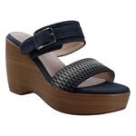 Sandalia con plataforma en colores clásicos de entrada para meter, con tira inferior multicolor y tira superior con una hebillada metalizada, la plataforma alta con diseño amaderado que pueden adaptarse a distintas ocasiones.