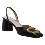 Stiletto de tacón con una hebilla dorada en la parte frontal que añade un toque de lujo y distinción. El diseño de talón descubierto con correa ajustable proporciona un ajuste cómodo y seguro.
